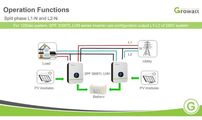 El Inversor Growatt SPF 3000TL LVM es un equipo moderno, robusto, confiable y de alta calidad, fabricado por la marca número uno en ventas de inversores residenciales y comerciales a nivel mundial. Tenemos los inversores con un voltaje de bacteria de 24VDC o 48VDC. El equipo combina un inversor, controlador de carga solar MPPT y cargador de baterías. Con sus 20ms de transferencia automática permite la conmutación ininterrumpida (UPS). Conectando dos inversores en serie se puede formar sistemas Split Fase 110VAC -0-110VAC para alimentar consumidores de 110VAC como tambien 220VAC.